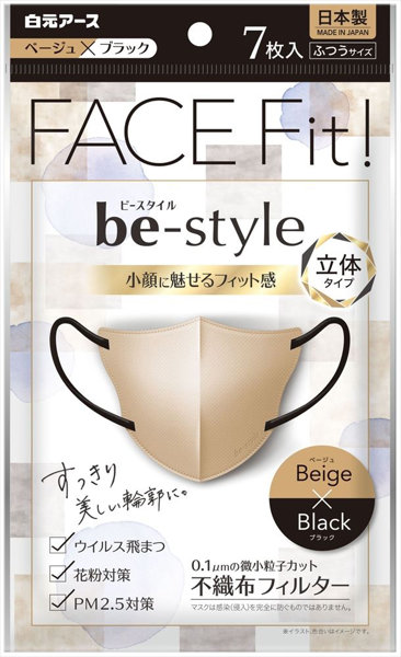 小顔に魅せるフィット感の女性用立体マスク。すっきりみせるスマートカット。メイクがつきにくくやさしい肌ざわり。0.1μmの微小粒子カットの不織布フィルター。マスクの色:ベージュ、耳ひも:ブラック。