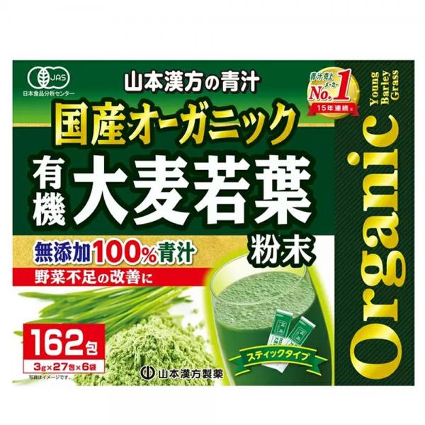 山本漢方製薬 国産 オーガニック 有機 大麦若葉 粉末 青汁 【1箱 】セット国産オーガニック大麦若葉を100%使用した無添加の青汁です。山本漢方の青汁は原材料である大麦若葉の産地にも、製法にも、品質管理にもこだわり続けて青汁売上1位(ドラッグストア)を連続で獲得しています。商品の説明●山本漢方製薬 国産 オーガニック 有機 大麦若葉 粉末 青汁 スティックタイプ 1箱1箱に3g×27包×6袋 合計162包入っています。スティックタイプで持ち運びにも便利です。牛乳やヨーグルトに混ぜたりいろいろ工夫して青汁を手軽に楽しめます。毎日の習慣に。1杯の青汁で、現代人に必要な野菜成分がたっぷり入っています。匂いや味にくせがなく、素材本来のシンプルな味と香りは毎日飲んでも飽きのこないおいしさ。注意事項※開封後はお早めにお召し上がりください。※粉末を直接口に入れると、のどにつまるおそれがありますのでおやめください。※本品にはビタミンKが含まれるため摂取を控えるように指示されている方は医師、薬剤師にご相談ください。※万一からだに変調が出ましたら、直ちにご使用を中止してください。※天然の素材原料ですので、色、風味が変化する場合がありますが品質には問題ありません。※小児の手の届かないところへ保管してください。※商品のリニューアル等により、お手元に届いた商品とパッケージデザインや内容量が異なる場合があります。※高温多湿の場所を避けて保存してください。※ギフト対応(ラッピング等)は致しかねます。