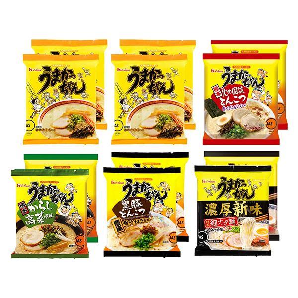 ハウス食品 うまかっちゃん 九州の味 ≪ 5種類 12食 ≫セットです。うまかっちゃんは、ハウス食品から近畿・中国・四国・九州・沖縄地区限定で発売されている袋麺です。麺の直径1.4mmを1.2mmへ変更し、麺を細くしました。さらに独自の配合・製造技術によって、油揚げ麺の特徴である湯戻りしやすさを抑制し、かつ熱風乾燥麺にはない油揚げ麺特有のおいしさを維持した特製麺です。細くてもしっかりコシのある麺に仕上げました。災害時の非常食や、食品のストックなどにもご活用頂けます。【 セット内容 】●うまかっちゃん 九州の味 ( 豚骨 ) 94g×4食●うまかっちゃん 九州の味 ( 博多 からし高菜風味 )93g×2食●うまかっちゃん 九州の味 ( 黒豚とんこつ 鹿児島焦がしねぎ風味 ) 92g×2食●うまかっちゃん 九州の味 ( 熊本 香ばしにんにく風味 ) 92g×2食●うまかっちゃん 九州の味 ( 濃厚新味 ) 84g×2食【 商品の説明 】●うまかっちゃん 九州の味 ( 豚骨 )「うまかっちゃん」は地元九州で愛される、とんこつ袋ラーメンの代名詞の定番商品です。スープは豚骨エキスをベースに野菜エキス・香辛料でまとめた白濁したスープです。ポークの香り高いオイルがおいしさを一層ひきたてます。●うまかっちゃん 九州の味 ( 博多 からし高菜風味 ) 博多のラーメン屋さんでおなじみのからし高菜の風味と辛さに、唐辛子の辛味を効かせ特徴づけたすっきりしたとんこつスープのラーメンです。気休めではないしっかりした辛さがありますので、辛いものが苦手な方はご注意ください。●うまかっちゃん 九州の味 ( 熊本 香ばしにんにく風味 )熊本(火の国)のラーメンらしい香ばしいにんにく風味が特徴のうまかっちゃん。こんがり揚げたにんにく風味の特製「調味オイル」が香りを引き立てます。焦がしにんにく油を使った特製「調味オイル」で特徴付けしているので、熊本(火の国)のラーメンらしい、香ばしいにんにく風味のとんこつラーメンが味わえます。●うまかっちゃん 九州の味 ( 黒豚とんこつ 鹿児島焦がしねぎ風味 )黒豚のとんこつに、鶏ガラや野菜の風味を加えたスープに、焦がしネギのトッピングと香りで特徴づけした鹿児島風のとんこつラーメンです。※ポークエキスのとんこつ原料中、黒豚とんこつは50%●うまかっちゃん 九州の味 ( 濃厚新味 )基本の味である「うまかっちゃん」とはひと味違うおいしさを持った濃厚なとんこつスープを、細くてかたい麺で味わうラーメンです。スープには ラードを使用し、どっしりとした香りとコクを表現した調味オイルに、ネギ油の香りでアクセント付けしました。隠し味にチャーシューのタレのような甘めの醤油ベースの調味料を加え、とんこつ脂の香りとコクを重視したおいしさのスープに仕上げました。【 注意事項 】※商品のリニューアル等により、お手元に届いた商品とパッケージデザインや内容量が異なる場合があります。※常温での発送です。※ギフト対応(ラッピング等)は致しかねます。■配送方法宅配便(佐川急便・ヤマト運輸・日本郵便)※宅配便業者のご指定は受け付けておりません。