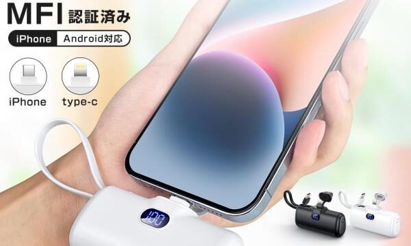 モバイルバッテリー 20000mAh 大容量 超小型 軽量 5台同時充電 PSE 5v/2a ワイヤレス充電対応 スマホ充電器 残量表示 iPhone 14 mini Android ケーブル内蔵 2025