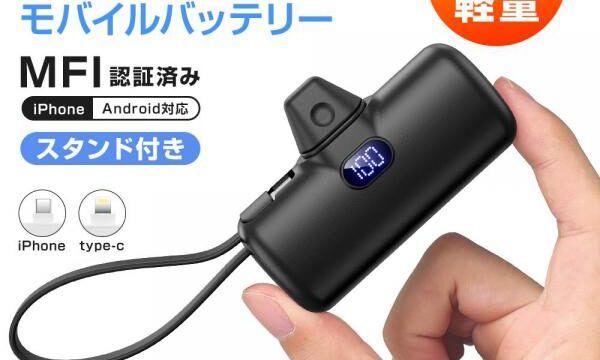 モバイルバッテリー 大容量 超小型 MFi認証品 2台同時充電 6000mAh 軽量 ケーブル内蔵ミニ 便利 オシャモバ 充電器 超軽量